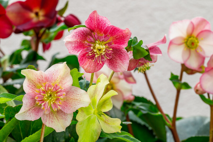 Für alle, die es bunt mögen, sind Lenzrosen die perfekte Wahl. Ihre beeindruckenden Blüten, die bis zu 10 cm groß werden können, leuchten in einer Vielzahl von Farben: von sattem Violett über zarte Pastelltöne bis hin zu mehrfarbigen Varianten. Manche Sorten haben sogar gefüllte Blüten – ein wahrer Hingucker im Wintergarten.