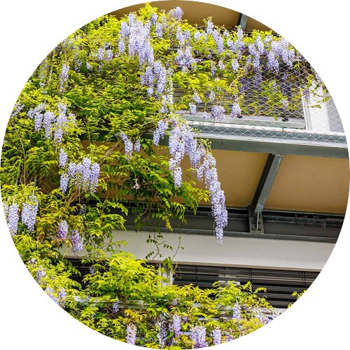 - Rankgitter, Seilsysteme oder Spaliere sorgen für Struktur. Achten Sie bspw. beim Blauregen darauf, dass sie ein ausreichend stabiles Rankgerüst wählen!