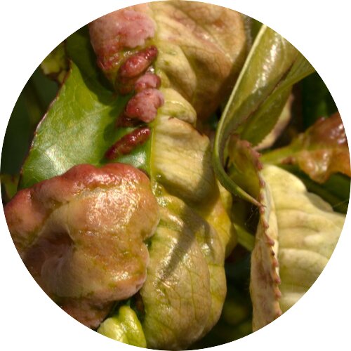 - Kräuselkrankheit (vor allem bei Pfirsichen, Nektarinen, Mandeln) → stark verkrüppelte und verfärbte Blätter.
