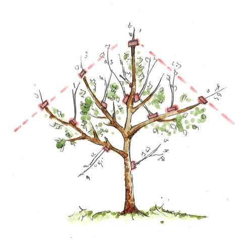 Mit der Zeit entwickelt sich so eine gleichmäßige, pyramidenförmige Krone, die stabil ist, viel Licht einfängt und reichlich Früchte trägt.