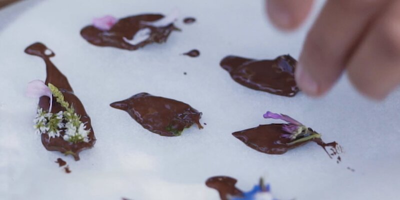 Wir verwenden noch einige essbare Blüten zur Dekoration und bestreuen die Schoko-Blätter anschließend mit ein wenig Kristallzucker (das dient aber nur zur Dekoration).
