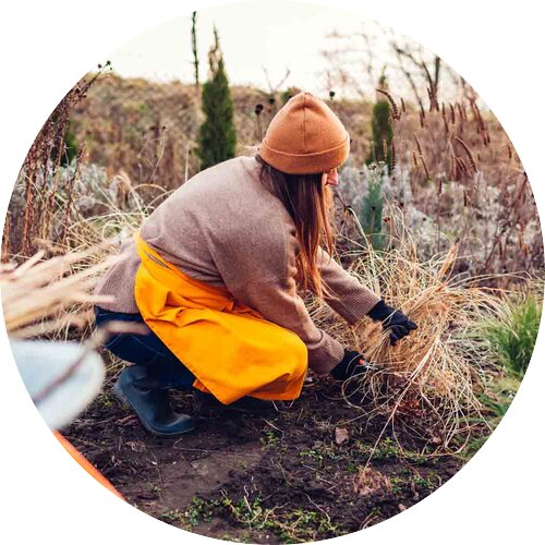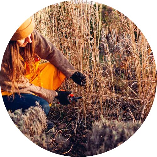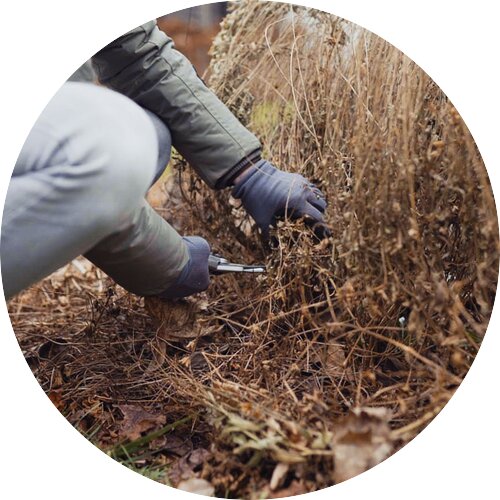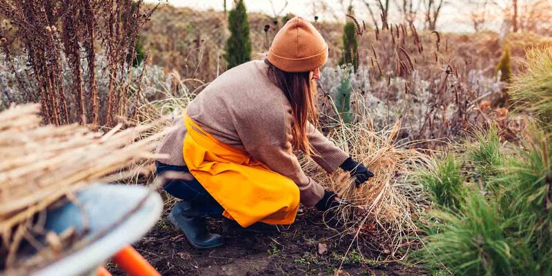 Man schneidet Stauden in etwa 10 cm über den Boden zurück. Manche Pflanzen haben bis zum Winter bereits alle Blätter verloren, hier kann man nur im Beet aufräumen oder die abgestorbenen Blätter als Mulchmaterial liegen lassen.