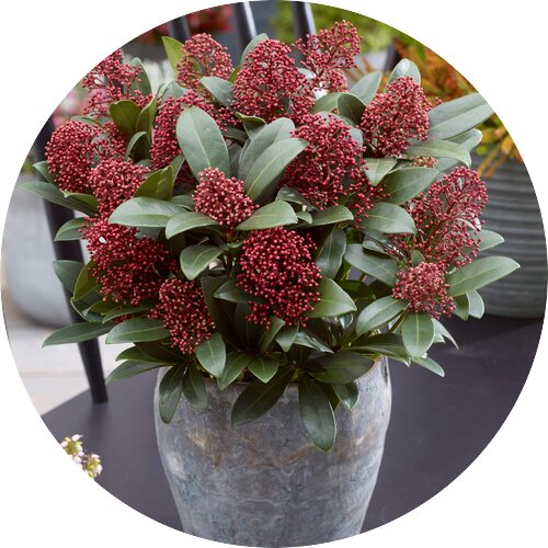 - Pflege: Die Skimmie braucht saure, humusreiche Erde. Sie sollte gleichmäßig feucht gehalten werden, aber Staunässe vermeiden.