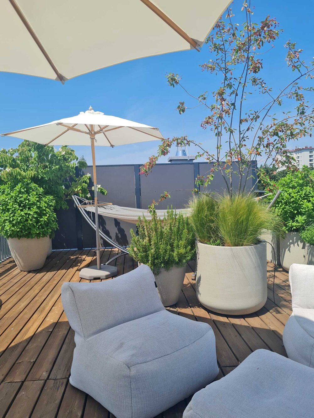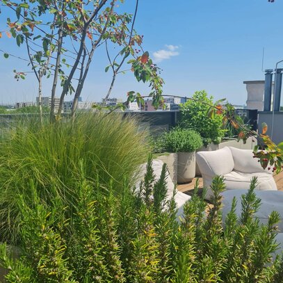 Wie oft bei Dachterrassen bestand auch hier die Herausforderung darin, eine Bepflanzung zu finden, die sowohl der intensiven Sonneneinstrahlung als auch dem stetigen Wind standhält. Gewünscht wurde eine gemütliche Terrasse, die als entspannter Chill-Out-Wohlfühlort dienen sollte und etwas Urlaubsfeeling in den Alltag bringt. Die hellen Farben der Möbel sollten sich harmonisch in der Bepflanzung widerspiegeln, weshalb eine Gestaltung mit weiß blühenden Pflanzen bevorzugt wurde. Zur Schaffung einer ungestörten Entspannungsatmosphäre wurde zudem ein Sichtschutz im hinteren Bereich der Terrasse gewünscht.