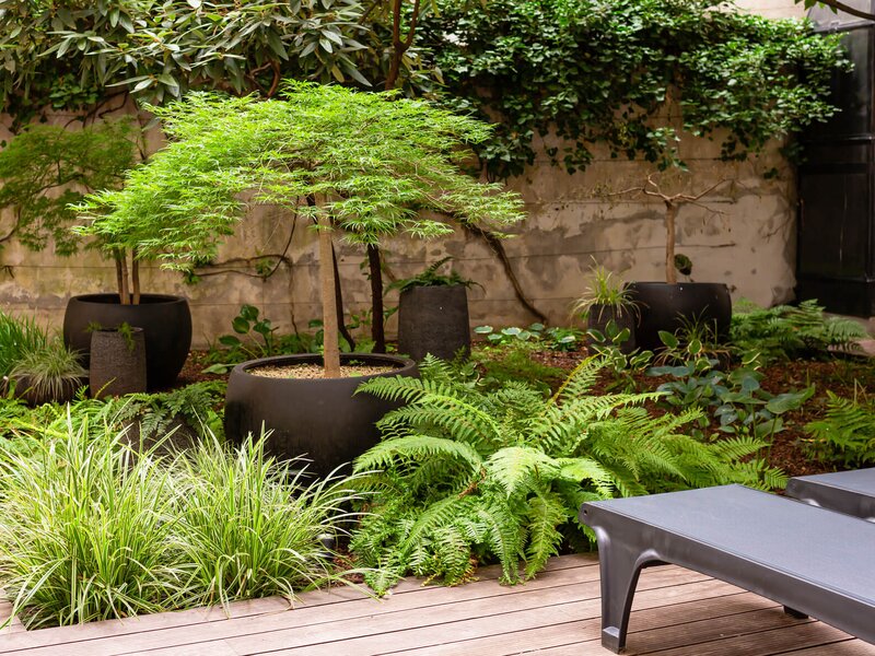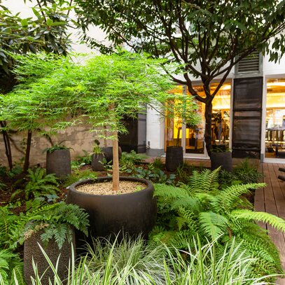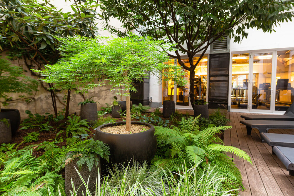 Unter dem Thema "Urban Jungle" entstand ein üppiger Schattengarten mit Japanischen Ahörnern, Gräsern, Farnen und Funkien, der auch abends mit Beleuchtung einladend wirkt. Dabei wurden die großen Bäume und Gehölze revitalisiert und konnten dadurch erhalten bleiben. Um zusätzlich spannende Höhenstrukturen zu schaffen, wurden in der Pflanzfläche Tröge platziert und bepflanzt. Mit den unterschiedlichen Grüntönen wird der sonst eher schattige Innenhof aufgehellt und lädt zum Verweilen und Entspannen nach einem anstrengenden Workout ein.