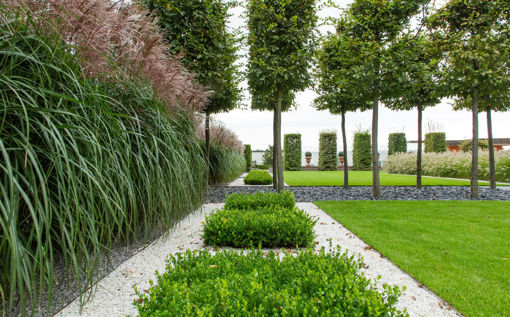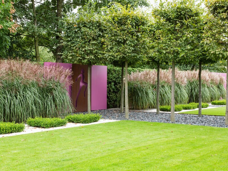 Der Designgarten ist geprägt von gradlinigen Formen und Gestaltungselementen: großzügige Rasenflächen in Kombination mit Kiesbeeten mit dunklem und hellem Splitt, hohen Gräserhecken, Eibenkugeln, Hainbuchen und anderen Formschnittgehölzen. Dadurch ergeben sich spannende Räume und die große Fläche wird in einige Teilbereiche strukturiert. Auch ein kleiner Liegeplatz auf einem Holzdeck und ein kleiner Wasserfall wurden dabei integriert. Ein Künstler fertigte Skulpturen an, die an leuchtend rosa Mauern angebracht wurden. Durch die teilweise immergrüne Bepflanzung und die spannenden Formen ist der Design-Garten ein ganzjährig dekoratives und elegantes Garten-Erlebnis.
