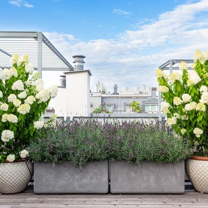 Mit einer schlichten Bepflanzung und einfärbigen Gefäßen kann man nichts falsch machen. Hier wurden graue Tröge mit Betonoptik gewählt. Mit einer Mischung aus immergrünen Ölweiden und sommergrünen Sträuchern kann man ohne neugierige Blicke wunderbar im "Relax-Bereich" entspannen. Klassische Pflanzen wie Rispenhortensien und Lavendel erfreuen das Gärtner-Herz mit Ihrer Blüte den ganzen Sommer. Für Gemüse und Kräuter findet sich auch ein Plätzchen direkt im "Essbereich" - damit man es nicht so weit zum ernten hat. So lässt es sich angenehm im Freien wohnen.