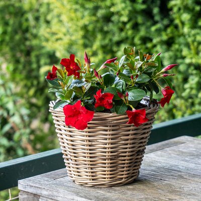 Die Sundaville® gehört zu den meistgekauften Balkon- und Kübelpflanzen des Sommers – und das zu Recht. Von April bis Oktober treibt sie unaufhörlich neue, leuchtend rote Trichterblüten, die sich vor dem sattgrünen, glänzenden Laub besonders wirkungsvoll abheben. Als leicht schlingende Pflanze lässt sie sich wunderbar am Balkongeländer oder an einem Rankgitter führen, macht aber auch im Kübel auf Terrasse oder Balkon eine ausgezeichnete Figur. Vier Pflanzen zusammen in den großen Weidenkorb gepflanzt ergeben ein üppiges, blütenreiches Sommerbild, das den ganzen Sommer trägt. Sie werden sehen, bald werden diese Pflanzen so üppig wachsen, dass der Korb kaum mehr zu sehen sein wird.