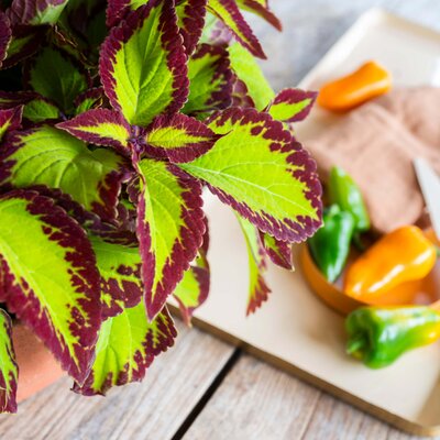 Die Buntnessel (Coleus blumei) ist der Spezialist für farbige Blattschmuck-Wirkung an Standorten, wo viele andere Sommerblumen versagen: halbschattig bis schattig. 'Velvet' aus der Glassworks-Serie zeigt ein lebendiges Blattmuster in Hellgrün mit flammenartiger Rot-Braun-Zeichnung – jedes Blatt wirkt wie ein Unikat, samtig und leuchtkräftig zugleich. Der Sortenname „Velvet" deutet auf die typisch samtartige Blattoberfläche hin, die das Licht auf besondere Weise einfängt.
