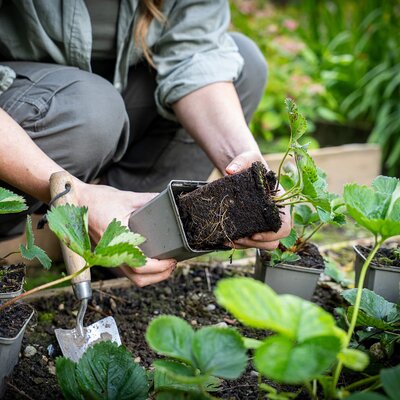 Die beste Pflanzzeit ist das frühe Frühjahr (März–April) oder der Spätsommer (August–September) – Herbstpflanzungen haben den Vorteil, dass die Pflanzen gut einwurzeln und im Folgejahr von Beginn an kräftig tragen. Pflanzabstand ca. 25–30 cm in der Reihe, Reihenabstand ca. 30–40 cm. Dabei unbedingt darauf achten, dass die Krone (der Übergang zwischen Wurzel und Blattansatz) auf Bodenniveau liegt – zu tief gepflanzt fault sie, zu hoch gepflanzt trocknet sie aus.