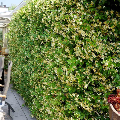 Der Jasmin ‘Star of Toscane’ wächst kletternd bis schlingend und benötigt eine Rankhilfe. Mit seinem dichten, immergrünen Laub eignet er sich hervorragend als Sichtschutz oder zur ganzjährigen Begrünung vertikaler Flächen.