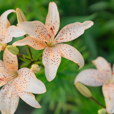 Die Lilie „Salmon Star“ überzeugt durch ihre harmonische Farbgebung: Zarte weiße Blütenblätter, die von einem lachsrosa Schimmer durchzogen sind, sorgen für ein edles und zugleich frisches Gesamtbild. Die großen, leicht nach außen gebogenen Blüten wirken besonders dekorativ und ziehen während der Blütezeit alle Blicke auf sich.