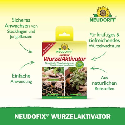Entweder: Neudofix WurzelAktivator in Wasser lösen (gut rühren) und Pflanzen gießen. Ein 20 g Beutel reicht für 5 Liter Wasser.