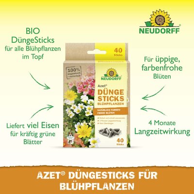 Die organischen Azet DüngeSticks für Blühpflanzen haben einen NPK-Wert von 7-3-6 und liefern ein speziell abgestimmtes Nährstoffverhältnis für üppige Blütenpracht und einen gesunden Wuchs der Pflanzen.