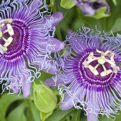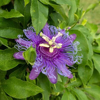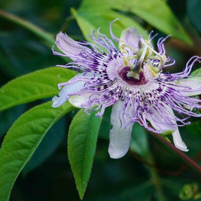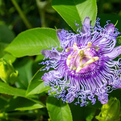 Ab dem Frühsommer erscheinen die typischen, filigran aufgebauten Passionsblumen. Die auffälligen Blüten zeigen ein harmonisches Farbspiel aus zartem Violett, Weiß und dunkleren Akzenten in der Nebenkrone. Sie öffnen sich fortlaufend über mehrere Wochen und machen die Passionsblume zu einem echten Blickfang. Gleichzeitig dienen sie als wertvolle Nahrungsquelle für Bienen und andere Insekten.