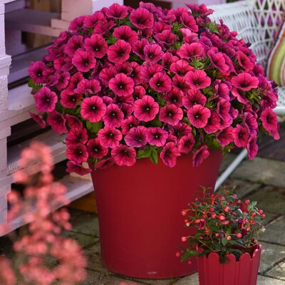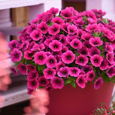 Die Kugelpetunie 'Potunia' ist eine attraktive Pflanze, die mit ihren trichterförmigen Blüten ab Mai auf sich aufmerksam macht. Diese Sorte zeichnet sich besonders durch ihren kugelförmigen und dichten Wuchs aus, wodurch sie zu einem Blickfang in jedem Garten wird. Unter optimalen Bedingungen kann sie eine Höhe von bis zu 40 cm erreichen und begeistert dabei mit ihrem enormen Blütenreichtum.