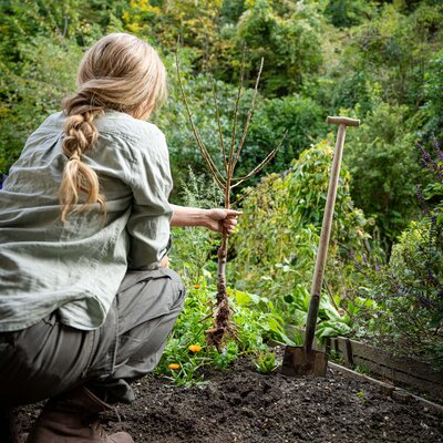 Wurzelnacktes Obst wird in der Vegetationsruhe gepflanzt – Oktober bis März, solange der Boden frostfrei ist. Herbstpflanzung ist ideal, damit die Wurzeln noch vor dem Winter einwachsen. Pflanzloch großzügig ausheben (ca. doppelt so breit wie das Wurzelwerk), Wurzeln leicht auffächern, mit humusreicher Erde auffüllen, gut angießen. Die Veredelungsstelle muss knapp über der Erde bleiben.